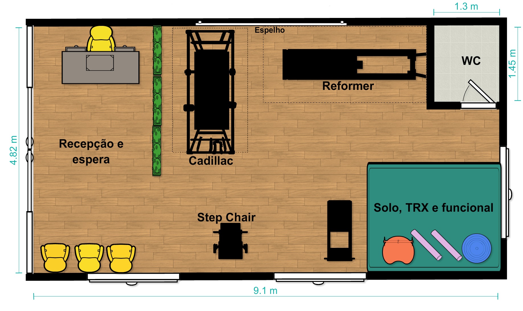 Mas se você já adquiriu os aparelhos e está se preparando para a etapa de montar um studio de pilates, ainda assim um layout é importante. Ele permitirá que você veja várias opções de otimizações possíveis, até chegar na ideal.